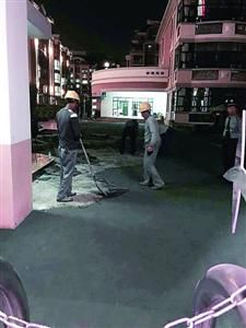 建筑方派人连夜铲除之前铺设的塑胶跑道 /学生家长供图昨天,晨报关注了松江区华亭第二幼儿园部分孩子出现流鼻血、皮疹、嗓子疼等症状,家长怀疑是幼儿园新铺的塑胶跑道所致。记者从松江区教育部门获悉,华亭二幼塑...