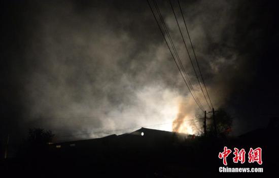 10月12日21时46分,天津公安消防总队接报警,位于北辰区西堤头镇西堤头村的一仓库发生爆燃。起火地点为存放酒精等原料的仓库,火情已被基本控制,目前尚未接到人员伤亡报告。 图片来源:CFP视觉中国  中新网10月13...