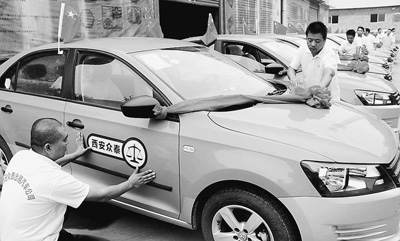 国庆期间,西安众泰出租汽车有限公司从外地购进的47辆新车到货,股东们为新车贴上公司的标识。  拼客、绕道、拒载、不打表……网友总结了西安出租“八大怪”,“打不上车,证明你来过西安。”而记者在西安火车...