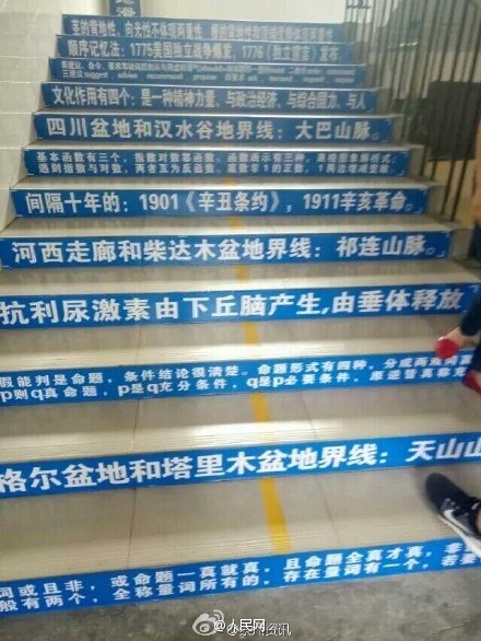 • 四川中学楼梯横条贴知识点 网友:走楼梯也能学习