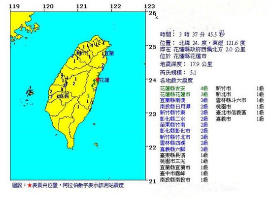凌晨3时37分花莲发生芮氏规模5.1地震,震中在花莲市内中国台湾网9月30日讯 据台湾《中时电子报》报道,台湾“中央气象局”网站报告指出,30日凌晨3时37分花莲县发生芮氏规模5.1强震,而且震中在县政府西偏北方仅2...