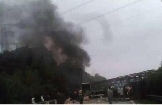 事故现场。9月25日上午9:50许,潭邵高速公路1075公里处,一辆广西牌照货车冲过中间护栏撞到对面的一台邵阳牌照小车,并造成另外两车相撞,其中一辆核载35人的客车起火,事故现场浓烟滚滚、火光冲天,造成多人伤亡。省...