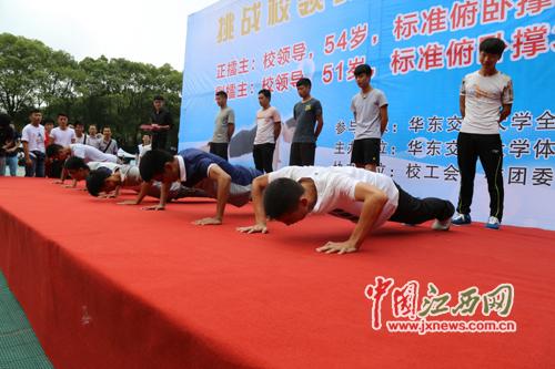 擂台赛现场。  该校副校长张玉清现场做起标准俯卧撑,设下擂台。  近日,江西各高校陆续迎来大一新生报到。9月4日,华东交通大学迎新第一天,当天上午,该校田径场上举行的一场特殊擂台赛吸引众多新生和家长...