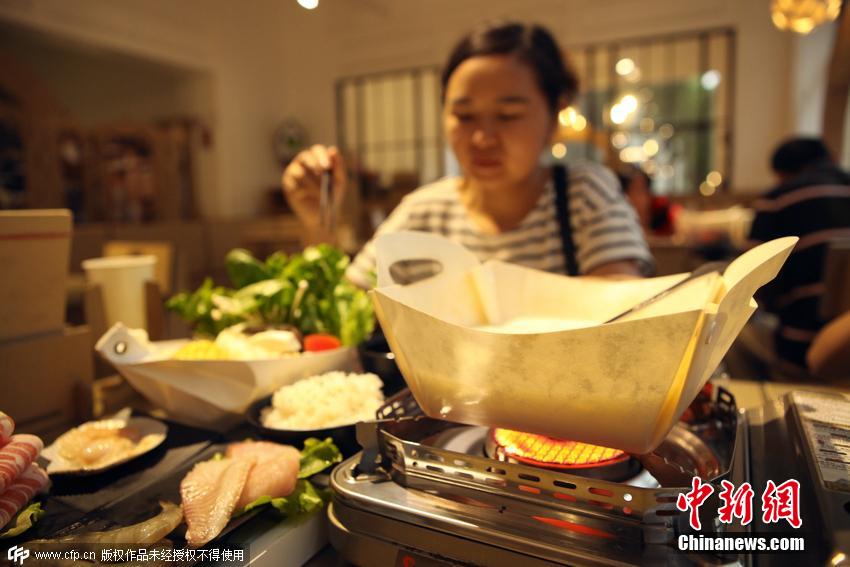 2015年8月28日,上海,自古以来,火就是纸的“天敌”。然而,在位于上海闵行七宝联明路上的纸箱王创意园区的“纸锅餐厅”里,从桌上沸腾的火锅到吧台,从桌椅到台灯,你看到的一切几乎都是用“纸”制的。王...