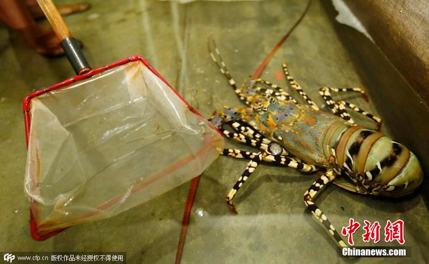 2015年8月7日,福建泉州,惠安一渔民捕获4斤重龙虾。这只龙虾浑身色彩斑澜,还有着很酷的名字,叫做“中华锦绣龙虾”。这种龙虾在深海生长,已经很少见,这么大的更是难得。 图片来源:CFP视觉中国...