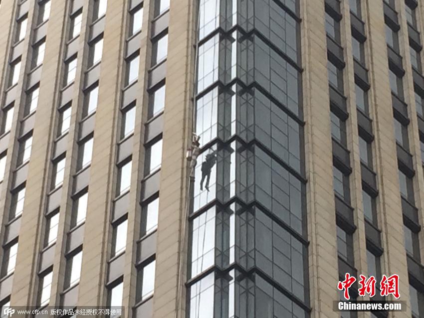 2015年8月7日,南京,下午4:50狂风暴雨河西万达广场一栋大楼外墙正在清洗玻璃的三名蜘蛛人迅速下降,没想到其中一名男子绳索被搅乱挂在16楼动弹不得,在大风中摇摇晃晃。消防警方迅速到场后,消防员到16楼砸玻璃将男...