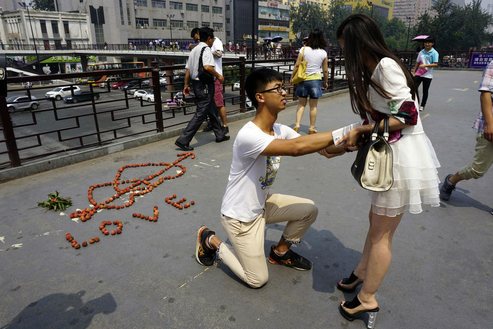 2015年8月7日中午,西安,炎炎烈日下,一名男青年在小寨人行天桥上,用上百个鲜荔枝摆成心形图案,向自己喜欢的女孩求婚,女孩吃下他剥好的一个荔枝后说“你太幼稚”,然后红着脸转身离去。 ...