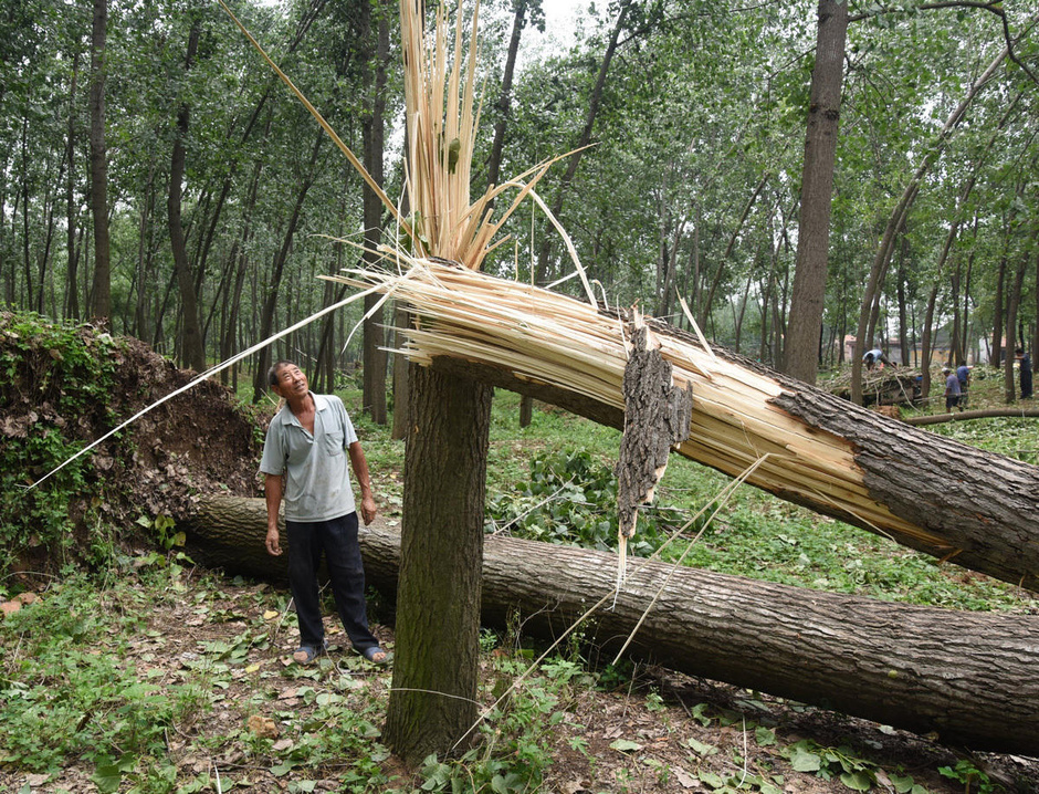 8月6日,山东省沂南县大庄镇北双泉村的一名群众在查看被大风刮断的大树。8月5日,山东省沂南县大庄镇21个村庄遭受暴风袭击,大批树木被刮倒或拦腰折断,部分房屋倒塌,160个养殖和蔬菜大棚垮塌,4000多亩玉米倒伏,所...