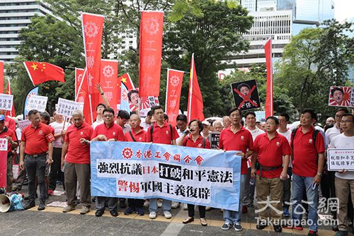 图:工联会昨日游行至日本驻港领事馆,抗议日本首相安倍晋三强推安保法/大公报记者何嘉骏摄  中新网8月3日电 据香港大公网报道,香港工联会200多人2日由中环遮打花园出发,游行至日本驻港领事馆,抗议日本首相...
