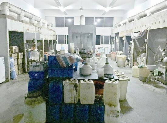 图为:制毒窝点武汉海关昨日公布了6月17日破获的一起走私毒品案,并捣毁了以武汉某大学在职化学副教授为带头人的制毒窝点。2014年11月,武汉海关机场办事处邮检科例行检查发现,一份寄往美国的快递包裹中藏有若干白色...