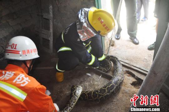图为消防官兵抓捕蟒蛇。 罗毫庭 摄图为被抓捕的蟒蛇。 罗毫庭 摄  中新网防城港7月1日电 (李敏军 罗毫庭 黄培观)一条长约3米、重32斤的蟒蛇闯入广西防城港乡村民房“偷鸭子”时被村民发现并报警。因为饱餐了一...