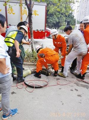昨日约13时10分,龙岗区愉龙路,桑小兰踩上一个污水管检查井后身子突然下沉。掉入井前,她将手中女儿托出,丈夫杨勇下井施救,因吸入沼气晕倒。
