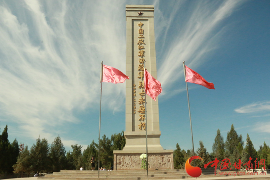 中国工农红军西路军纪念碑建于1987年,位于纪念馆正中。碑身高19.36米,厚1.2米,宽3.0米,象征1936年12月30日中国工农红军西路军主力进驻临泽县境内,碑体正面的碑文“中国工农红军西路军烈士永垂不朽”是由徐向前元帅题写。本网记者 李秀清 摄