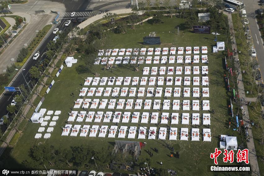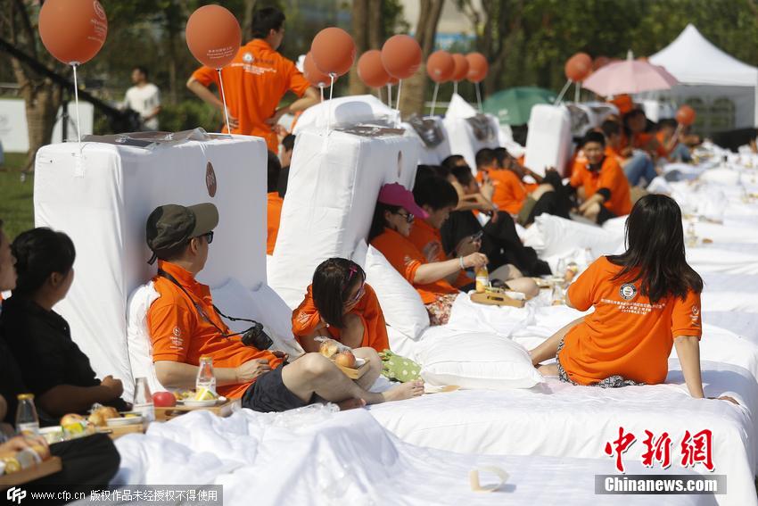 2015年8月16日,北京,400多位市民在潮白河喜来登酒店完成了最多人在床上吃早餐的吉尼斯世界纪录挑战,打破了去年11月在上海创造的388 人次的吉尼斯世界纪录。王钰谊摄图片来源:CFP视觉中国