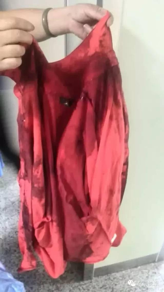 图为林女士被血浸湿的衣服。昨晚,经过三个小时的抢救她,其所流的血将整件衣服浸湿。目前,该男子已被警方控制,据东快记者了解,行凶男子为梦山路旁一所学校的大学生,或因家庭矛盾外出行凶,昨日上午,警方仍在现场拍照调查取证,作案凶器(一把工具刀)已被找到,案件仍在进一步调查中。受害女孩说,自己和行凶男子素不相识,也不清楚为何对方要对自己下手,至于行凶的过程,她不愿透露。