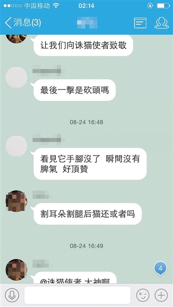 网友“血债必须血偿”提供的虐猫群聊天记录截图。