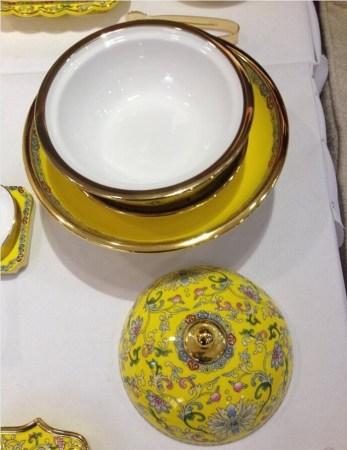 全套瓷器中有两大件最吸引人注意。一个是“占地面积”最大的冷菜盘,是由方形的大底盘与圆形宝塔顶的盖子组成,设计暗合中国传统的“天圆地方”一说。其中,宝塔顶盖的设计灵感来自于北京的天坛。据庄志诚介绍,在中国传统餐具中,并没有使用“冷菜盖”的习惯,而西餐则惯用金属制作冷菜盖。