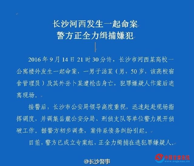 接警后,长沙市公安局领导高度重视,迅速赶赴现场指挥调度,并调集岳麓公安分局、刑侦支队等单位警力展开侦破工作。据警方初步调查,案件系债务纠纷引起。