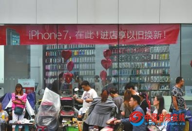 17日上午10点,今年刚上大学的小廖,趁着小长假打算入手新手机。在成都太升南路连续走了三家手机店后,一家人走进一家印有苹果“标志”的店铺。店内摆放有iPhone5S至iPhone7各种款式的苹果手机。