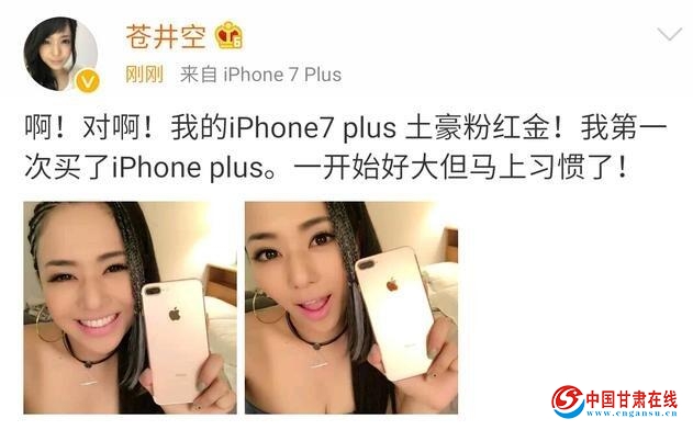近日,苍井空在微博上晒出了她的新手机:玫瑰金版iPhone 7 Plus。她将这个配色称之为“土豪粉红金”,但多大容量的还不清楚。苍井空表示,这是她第一次买Plus,觉得“一开始好大,但马上习惯了”。