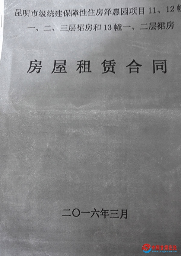 陈志提供的一份合同显示,2016年3月7日,昆明市房屋交易产权管理处与昆明市公租房管理公司(出租方)签署了一份租赁协议。协议规定,昆明市房屋交易产权管理处租赁泽惠园小区11、12幢的一、二、三层裙楼及13幢一、二层裙楼,用于办公。总面积11598.55平方米,租赁期限为20年。