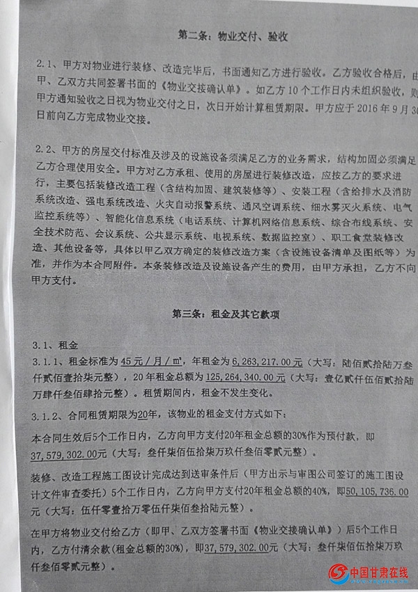 合同显示,租金标准为每月45元/平方米,年租金为626万余元,20年租金总额为1.25亿余元,后面注明“租赁期间内,租金不发生变化”。(来源:澎湃新闻网)
