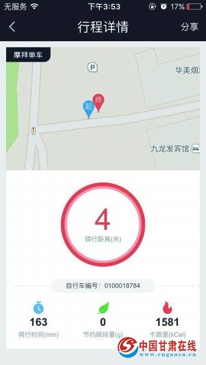 因韩先生是第一次使用摩拜单车,他担心停错地方被扣钱,特意在两个多小时后将车停回原地。“没想到系统提示我,称骑行花费600元。”让韩先生纳闷的是,开锁前和上锁时系统皆未针对这辆车给出任何提醒,上锁后却发现用车的费用如此之高。从韩先生提供的截图中可看到,行程的起点与终点都在五元桥的东南角,几乎重合(如左图),整个骑行时间为163分钟,花费为600元。事后,韩先生给优步客服发送邮件,未得到回复。