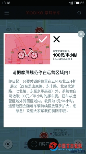 记者打开摩拜单车系统看到有提示称,“即日起,只要关锁的位置在五环及北五环扩展区(西至黑山扈路、永丰路,北至北清路、七北路,东至京承高速)外,系统会自动收取100元/半小时的挪车费。把车从运营区域外骑回区域内,收费为1元/半小时。”(如右图)