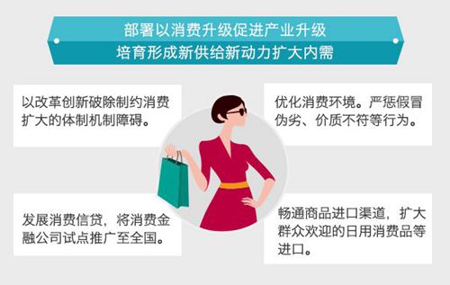 11月11日召开的国务院常务会议,部署以消费升级促进产业升级,培育形成新供给新动力扩大内需。李克强总理在会议上说,“老百姓兜里有钱了,想要过上更好的生活,不能限制大家出国买东西,更不能把国门关起来,还是要让消费者有更多选择自由”,“但与此同时,必须要以民众消费需求升级,促进国内消费品产业升级”。