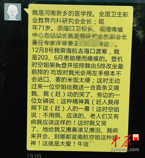 12月10日,记者也辗转联系到了这位河南籍老人。老人姓牛,原是河南新乡的一位医学教授,全国卫生职业教育内科研究会会长,8号和老伴儿搭乘飞机到海口是去过冬的。老人发来短信,介绍了当时的情况。短信中说,有人要给她拍照拍,她还说不用拍,这是应该的,我就忍不住又哭了,她给我又擦鼻涕又擦眼泪的。当时也不知道这个闺女的名字,如果有机会,我还应该再次表示感谢。