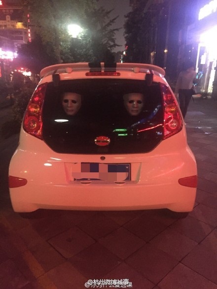 据@1818黄金眼 网友爆料:杭州古翠路文二路口,1辆小车后面发现两个好可怕的内饰,大白天看到都吓出一身冷汗。这要是晚上大灯一照,求后车的心理阴影面积。网友@你为什么爱逃课 称也拍到过这辆车,还是晚上…