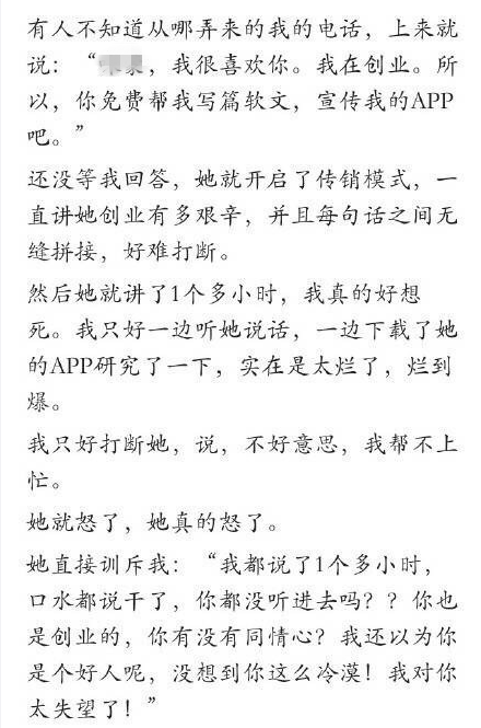 最后比如:因为你也是一个创业的,因为你居然就敢拒绝了我,所以你没有同情心,你冷漠,你太让我失望。