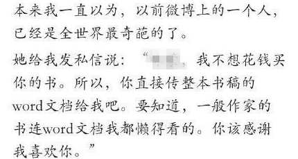 因为我不想花钱买你的书,所以你要把整本书稿传给我。
