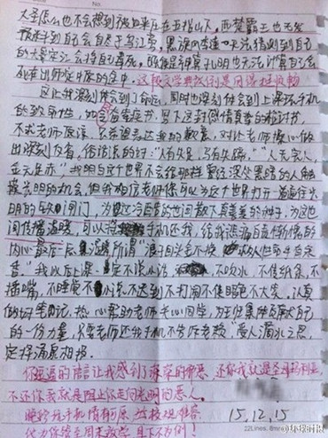 "我蹲在我内心的阴影里,测量着我的心里阴影面积,我手中拿着一把三角板不断重复测量着,答案令我颤抖,它的面积是无限" 多么真挚的感情,连我也被感动了。这师生一定用的同一本字帖,老师修改的也是认真,看样子第二天上课得全班面前全文朗诵了。唉,想到妹子死皮赖脸蹲在办公室门口求老师还手机的法子早就out了,说白了检讨书就是一句话:这次玩脱了,下次一定吸取教训不被你逮着了。