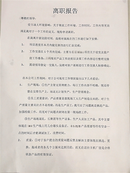 记者看到,除了写明离职理由、工作交接,离职信的大部分内容都与工作情况有关,涉及生产场地、技术、福利等五大项,对每项存在的问题都给出了建议,如“进一步培训检验人员”、“将生产会与质量会一起召开”、“根据实际分配人员”等,分别提到了质量意识、技术服务、增加福利等,记者数了数,一共有14个方面的内容。