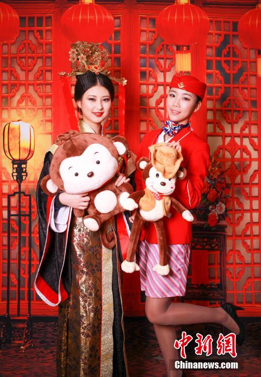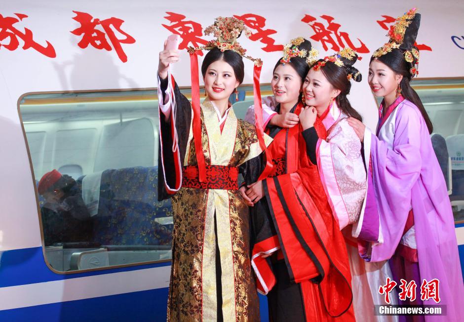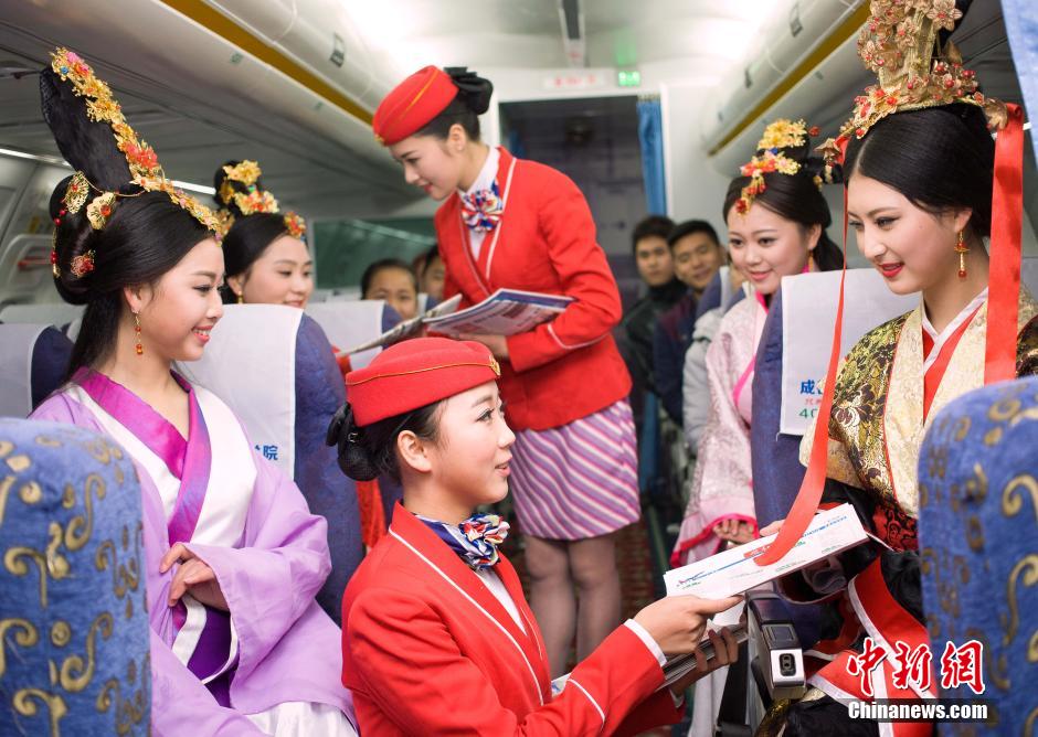 12月25日,“芈月”、“芈姝”和“魏夫人”在校园内的飞机上体验空乘服务。新年临近,成都某航空学院的一群准空姐们扮成电视剧《芈月传》中的芈月等古装人物形象。中新社记者 陈欣 摄