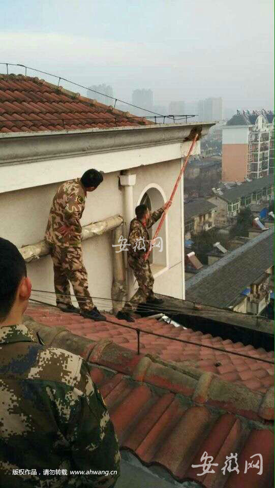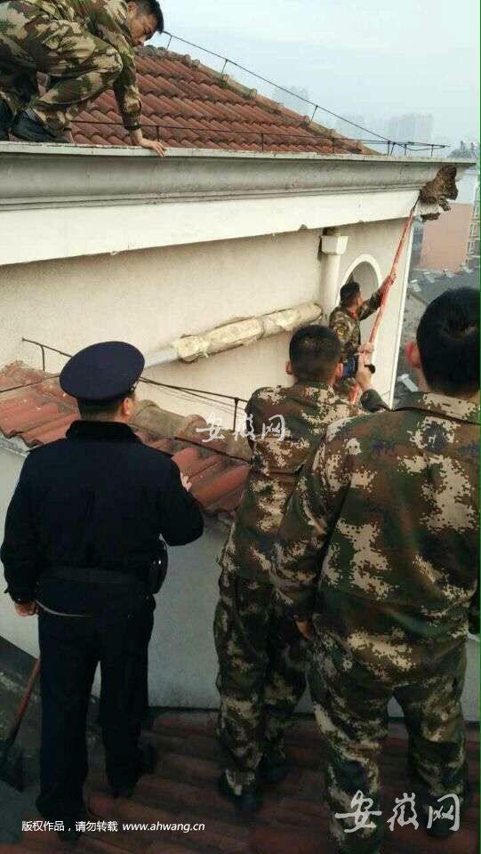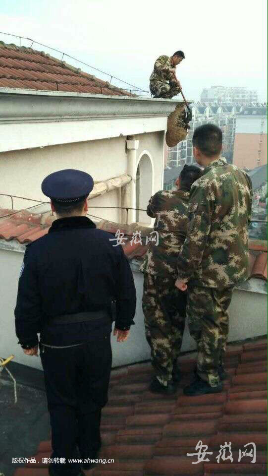 新安晚报 安徽网(www.ahwang.cn)讯 一窝马蜂在六安一中男生宿舍屋檐下筑巢,越来越大,威胁到学生安全。接求助后,辖区特警与消防官兵赶到,爬楼顶将其铲除。