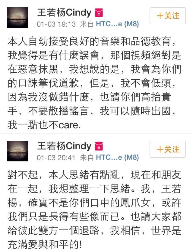 随后,凤爪女本人在网上发表了两段声明
