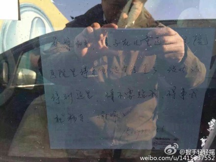 “警察叔叔,孩子在儿童医院住院,医院里停车场没有位置了,没办法停到这里,请不要贴我,碍事我就移车,谢谢了!”