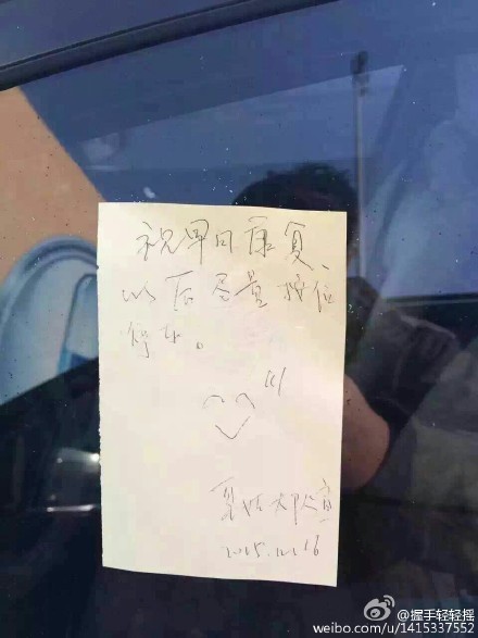 而交警大队也幽默的回复:“祝早日康复,以后尽量按位停车,皇姑大队宣,2015年12月16日。”