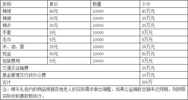 *本次活动欲筹集善款200万,为全国10000名60岁以上的贫困空巢老人提供价值200元的暖冬礼包。