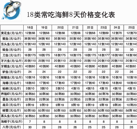 而说起价格,记者了解到,同一种鱼的个头、卖相不一样,价格也不一样。像当天的金昌鱼,18元一斤,个头大约一斤半左右。还有其他的价格都不同。并且摊主都普遍反映鱼基本上是一天一个价,目前市面上个头最大的鲅鱼,约有七斤多重,每斤价格26元,当天一个摊位前有人一下子定了十几条个头相仿的鲅鱼,很是壮观,而分量约两三斤一条的刀鱼,售价36元一斤,也很惹眼。