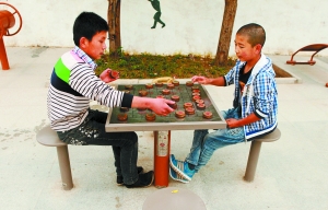 两名小“棋手”在新建成的文化广场下棋。  据兰州晨报报道 (首席记者 张鹏翔) 两年前的地震,让岷县两万余名低保老人、五保老人、独居空巢老人的家园遭受重创。为了抚慰老人创伤的心灵,让他们老有所养,岷县在...