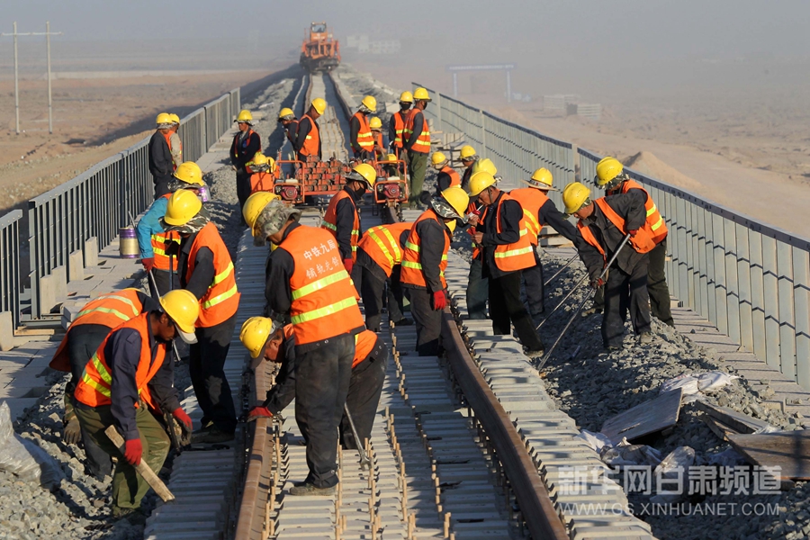7月22日,中铁九局铁路建设者在额哈铁路建设工地搬运托轨滑轮。  当日,随着新疆和甘肃交界处一组铁轨的铺设到位,额(济纳)哈(密)铁路铺轨顺利挺进甘肃,这标志着额哈铁路新疆段铺轨贯通。  额哈铁路是国家“...