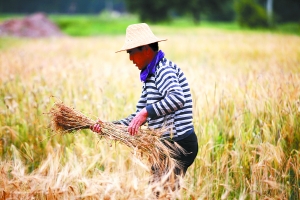 忙着收割小麦的村民。本版图片均为记者党运摄  新建成的村落掩映在青山绿水中。  盛夏七月,曾经的地震灾区一片忙碌景象:农田里,农民忙着收割小麦;新居里,村民忙着网上交易;农家乐里,村民忙着招呼生意...
