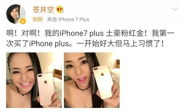 近日,苍井空在微博上晒出了她的新手机:玫瑰金版iPhone 7 Plus。她将这个配色称之为“土豪粉红金”,但多大容量的还不清楚。苍井空表示,这是她第一次买Plus,觉得“一开始好大,但马上习惯了”。据了解,苹果发布...