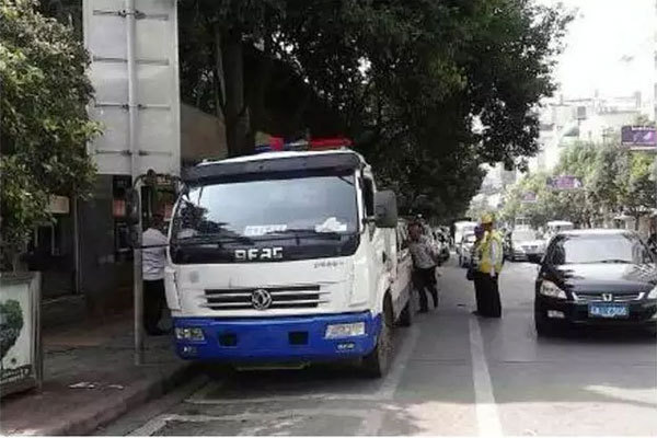 • 违停车贴满通行证 执法人员等待十分钟拖走
