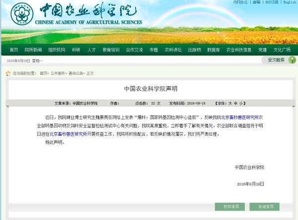9月18日,从中国农业科学院北京畜牧兽医研究所(下称“研究所”)退学的博士生魏景亮在知乎上发表文章称,其所在研究所的农业部转基因动物及饲料安全监督检验测试中心(北京)造假。具体而言有四点:“大规模的“赶作...