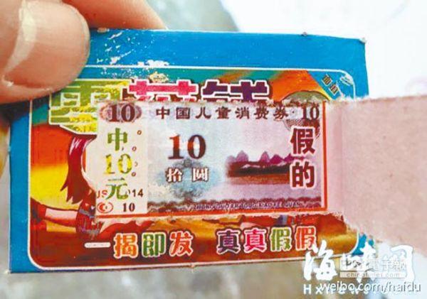 山寨彩券撕开后写着“假的”就是没中奖。(台湾中时电子报)  台媒称,大陆山寨彩券四处流窜,危害地方小学生,最近福建福州又发现,有店家出售山寨彩券,买1元(人民币,下同)的彩券,最高可中10元,买2元最高可中30...