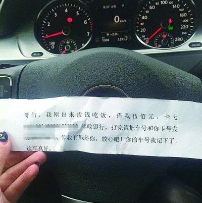 送孩子上学,回到车中竟然发现有人将纸条夹在车钱挡风玻璃上,打开一看,只见上面写着:哥们,我刚出来没钱吃饭,借我五百元钱,卡号XXX,邮政银行,打完请把车号和你的卡号发到XXX手机上,等我有钱还你!放心吧,...